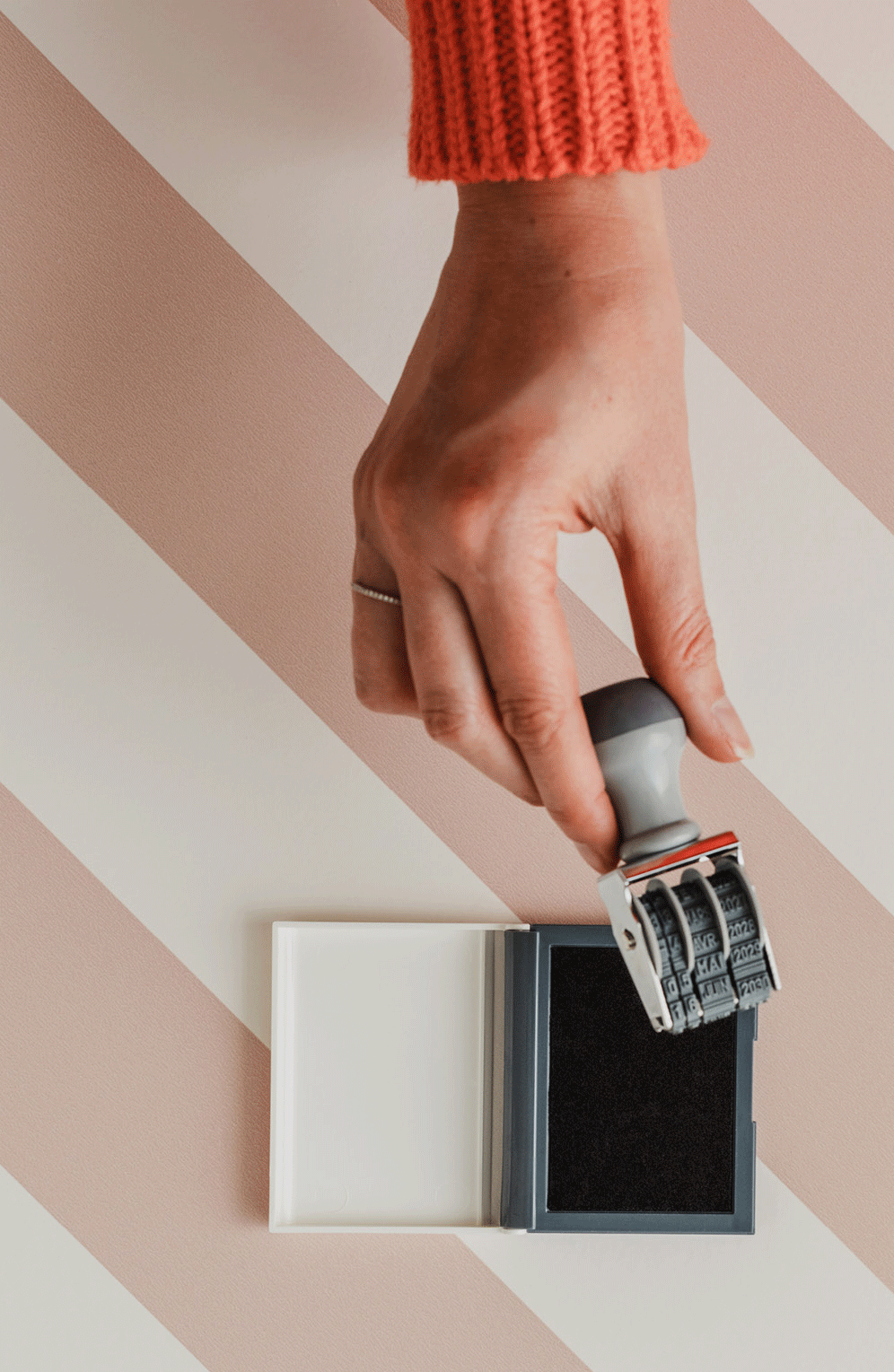 Une affiche illustrée, un tampon dateur et un encrier, réunis dans une même boîte.