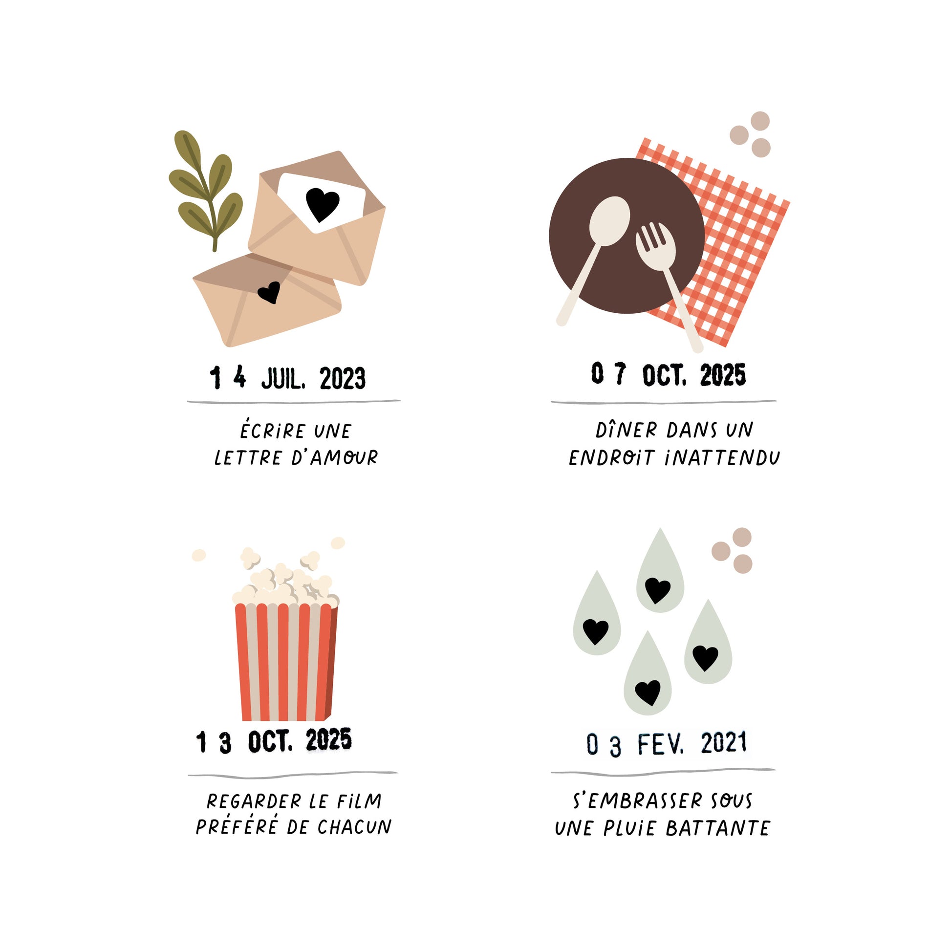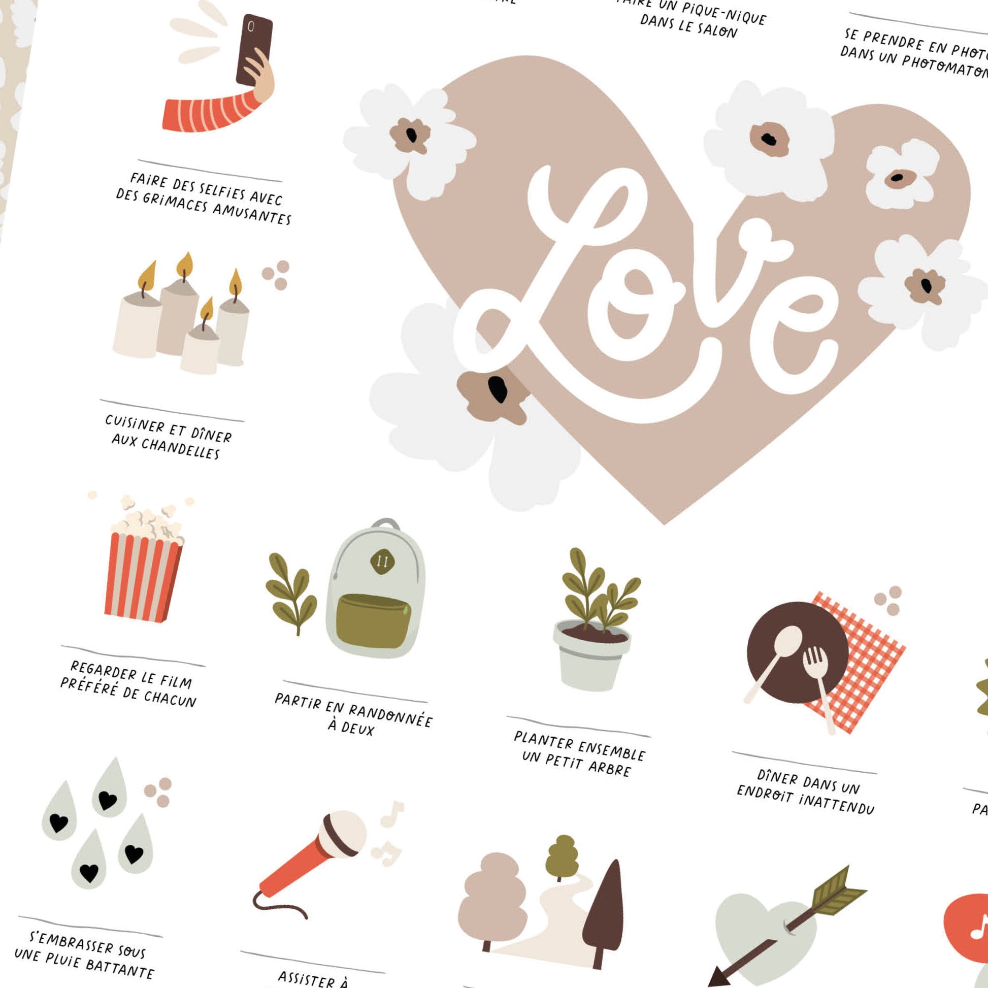 Des moments tendres, drôles et un peu fous à vivre à deux : se couvrir de tatouages éphémères, dîner à la bougie, lire un roman en duo à haute voix, cacher des petits mots doux… 24 idées pour s’aimer autrement, se surprendre et créer des souvenirs à deux. À chaque défi, une case à dater pour ne jamais oublier ces instants partagés.