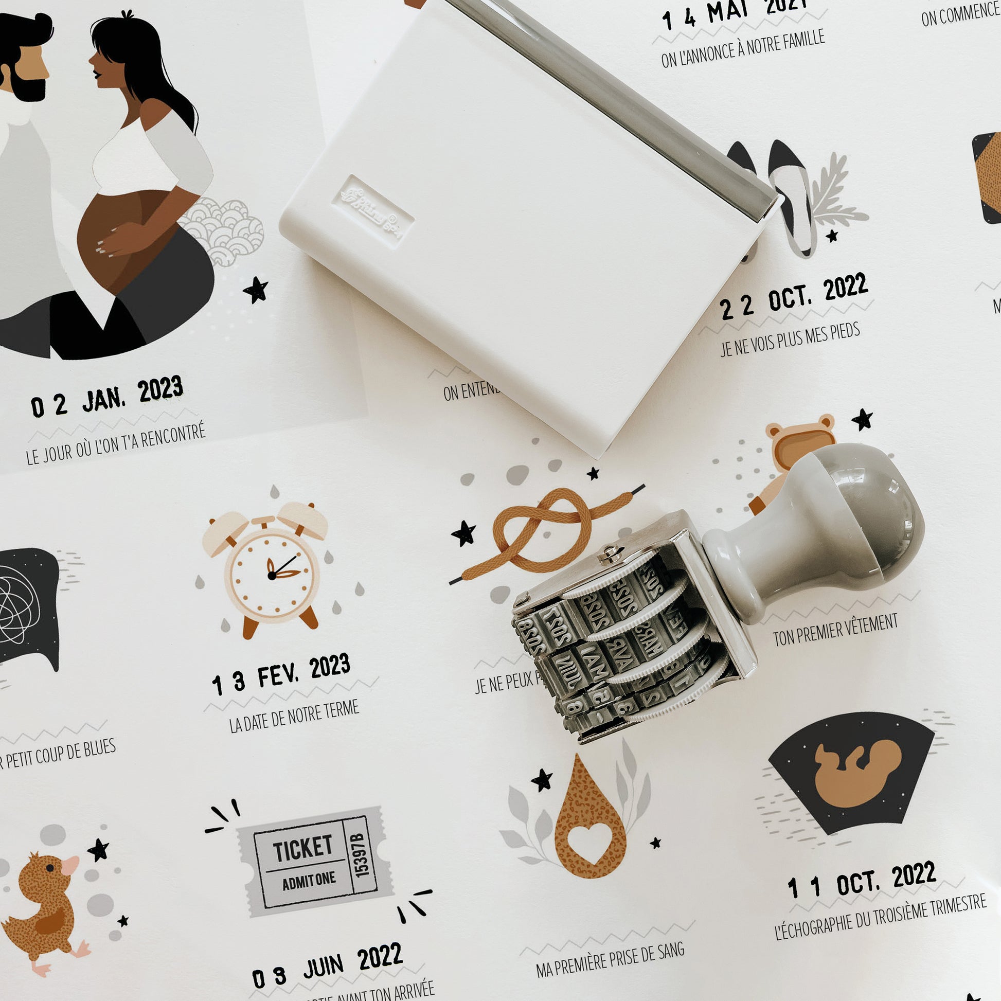 L'échographie du premier trimestre, le début du congé maternité, les premiers coups de pieds, les premières contractions... Tous les petits moments magiques de la grossesse sur une affiche. A afficher seule ou en duo avec l'affiche "Mes Premières Fois" !
